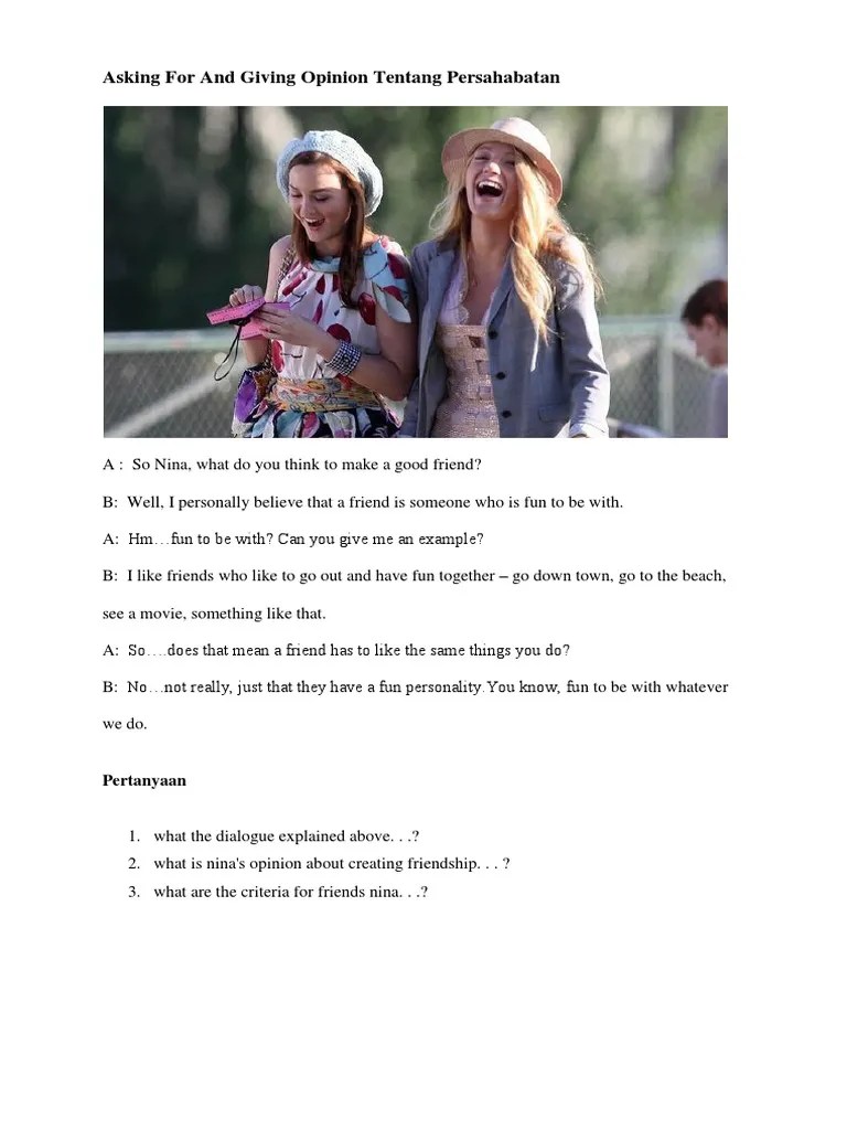 La lovers pasti sudah tahu apa itu asking and giving . What do you think about current technological developments? Bertanya tentang sebuah gagasan, ide, pendapat kepada orang lain. August 20, 2021 kampunginggrisla 0 comments. Guru memberikan gambaran tentang tema asking and giving for opinion. Setelah membahas mengenai opini dan fakta pada materi sebelumnya, kali ini kita akan membahas mengenai cara meminta dan . Teks fungsional pendek berbentuk percakapan singkatan memuat ungkapan asking and . 10 contoh dialog asking and giving opinion | english class bukan sekedar materi: Contoh percakapan sangat pendek asking and giving opinion dalam bahasa inggris. Ungkapan giving opinion adalah ungkapan memberi pendapat, biasanya didahului oleh asking opinion atau meminta pendapat. Contoh percakapan tentang asking for &giving something. Contoh percakapan atau dialog bahasa inggris tentang asking and expressing opinion juga disebut dengan meminta dan mengungkapkan pendapat . Jika di atas kita belajar mengenai menanyakan pendapat, .